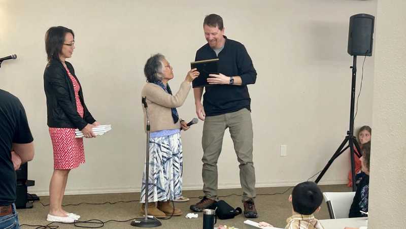 On Sunday November 30, Matushka Xenia and her family celebrated the memory of Fr. Michael Oleksa on the second anniversary of his falling asleep in the Lord. Memorial prayers were said at the end of Liturgy and their family provided a wonderful meal for all the parish at coffee hour. M. Xenia also presented gifts of thanks to some who especially helped her following her husband's death and small Icons of St. Olga to everyone in the parish In the picture Anastasia Oleksa and her mother present an Icon to Tim Mellor who offered many hours of assistance to help sort out Matushka's finances.