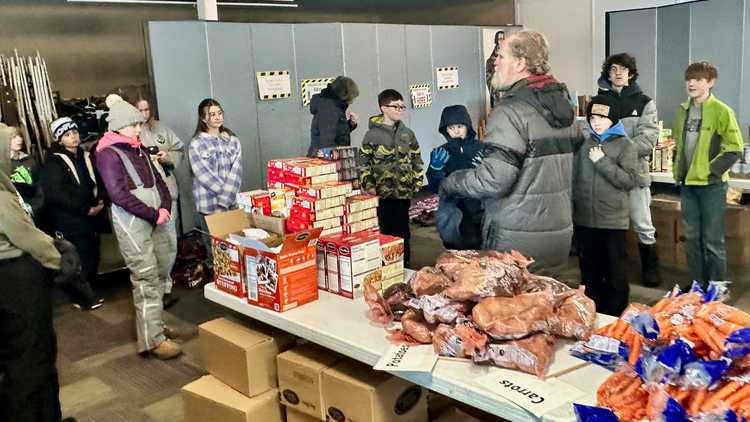 Deacon Kevin Dougherty gives instructions to 5th-7th grade students from Saint John's School to organize food distribution to families in Eagle River who need a boost for Thanksgiving day food. Many Churches in Eagle River collect this food to be distributed on the Monday before Thanksgiving. St. John's usually contributes boxes of stuffing as well as labor for the distribution.