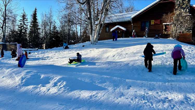 In near zero temperatures the children of Saint John's School still love sledding on the playground hill. The blue, green and pink sleds catch the sun as children glide down the hill and then hop off to run up the hill again. But hurry out of the way and don't turn your back on the hill or you might be swept off your feet.