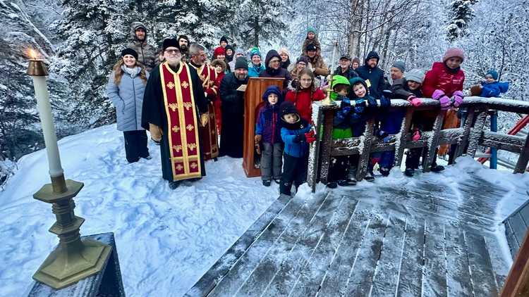 Mild winter weather and a snowmachine-packed trail made for a pleasant hike to St. Sergius Chapel. For many years it has been a tradition to make this hike. The first stop is the cemetery where we pray the 'Trisagion Prayers for the Departed' for Archimandrite Lazarus Moore (†11-27-1992) and all those buried in our cemetery. At the chapel we pray the 'Te Deum' service which especially prays for our country and the civil leaders.