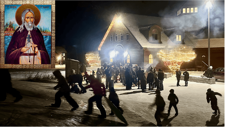 We celebrated Saint Herman's Day on Friday night by singing his Akathist. Afterward some families exchanged holiday cookies. Then all went outside for Russian Tea and shortbread cookies by two campfires. Children ran wildly up and down the sledding hill as Christmas carols played on the Carillon.